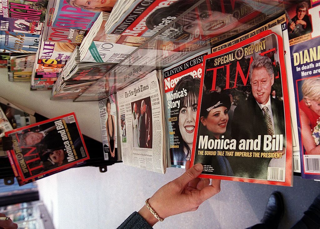 File/A woman reaches for a copy of Time Magazine on a news stand 26 January in New York, NY. The issue features a photograph on its cover of US President Bill Clinton and former White House intern Monica Lewinsky. (JON LEVY/AFP via Getty)