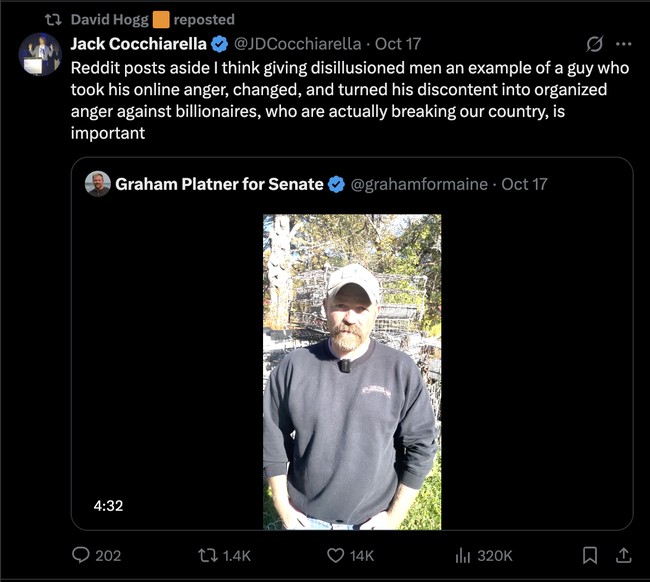 Now, a repost on X alone doesn’t mean that Hogg is embracing Platner’s candidacy… but the fact that Hogg’s political action committee Leaders We Deserve has endorsed Platner is a pretty good sign that Hogg is on board with his campaign.