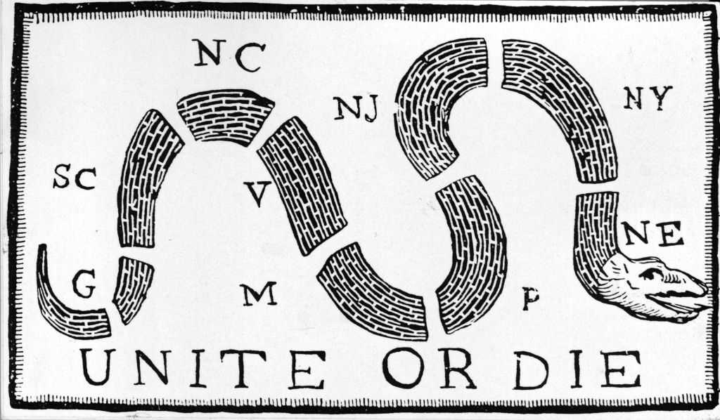 File/Circa 1770: A cartoon published by the writer, scientist and statesman Benjamin Franklin (1706 – 1790), urging the colonies to unite and resist British rule. (Photo by MPI/Getty Images)